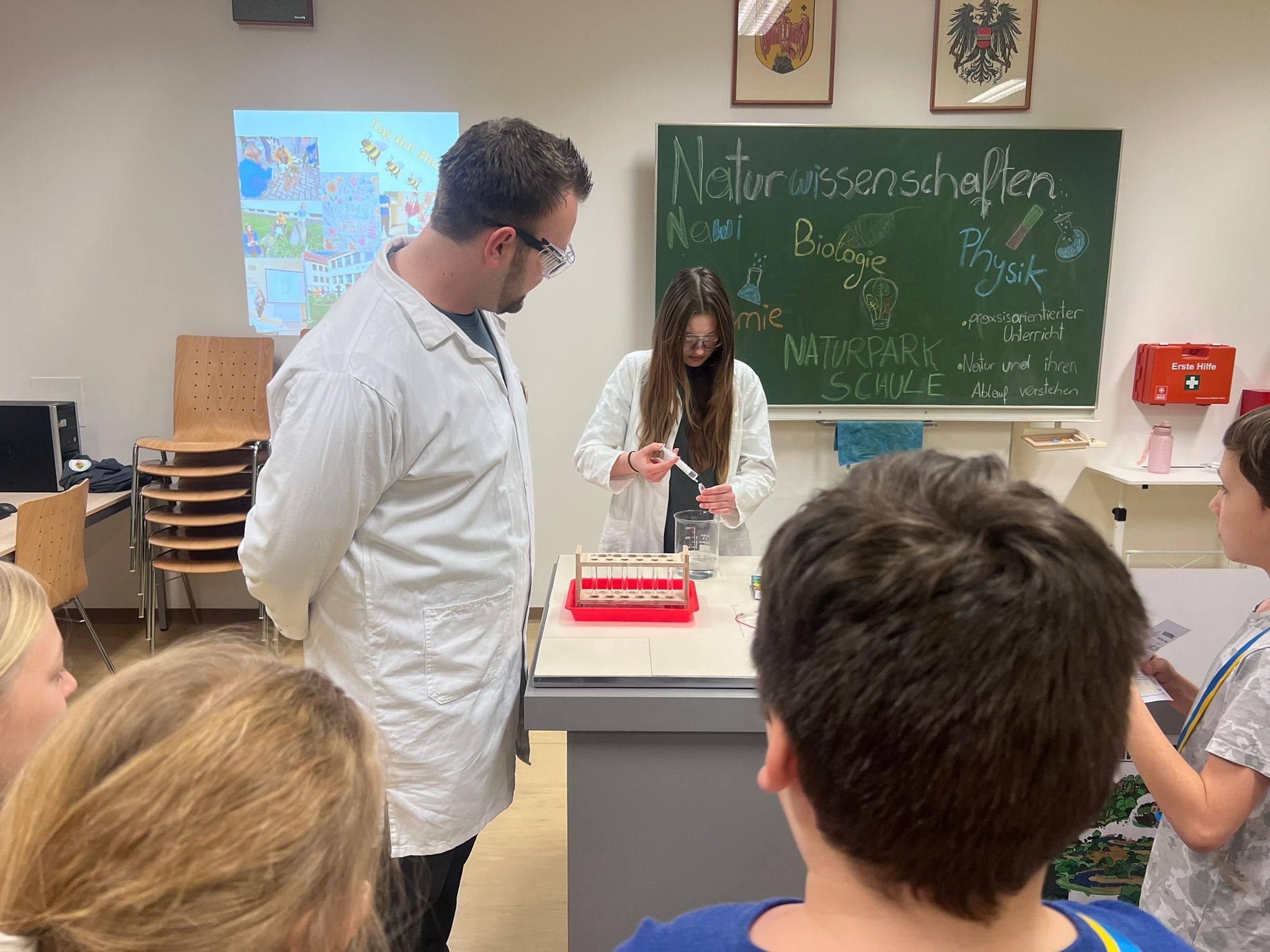 Anhand verschiedener Experimente wurden die vielfältigen Berufe der Industrie, in der die Chemie eine wichtige Rolle spielen, vorgestellt. Es wurde den Schüler:innen erklärt, wie man es schafft, dass Beton bis zur Baustelle nicht härtet und wie hingegen Blitzbeton hergestellt wird, der innerhalb weniger Minuten aushärtet. Auch das Lackieren von Metall mittels elektrischem Strom wurde vorgeführt.
